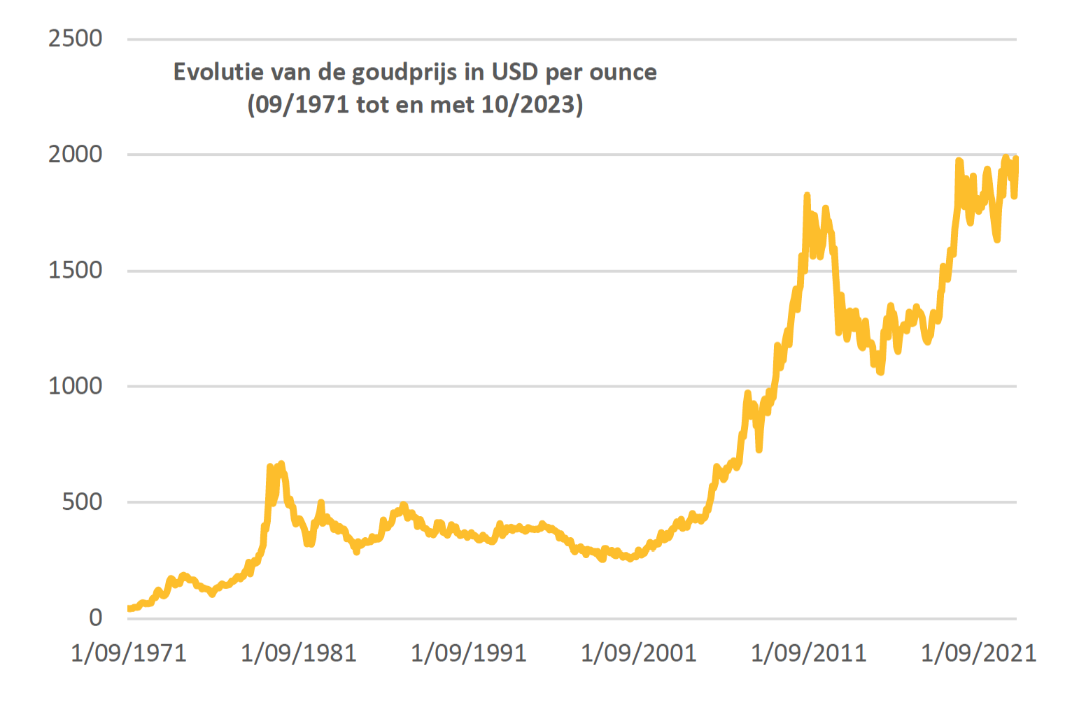 Daarnaast leidt het overschakelen van een geldstelsel gebaseerd op fiatgeld naar een op fysiek goud tot een totale ommekeer op het vlak van het toekennen van krediet: de kredietverlening wordt tenslotte functie van het goudbezit van de centrale bank. Zelfs indien de monetaire goudprijs op een zeer hoog niveau zou worden vastgelegd, dan betekent dit dat het aangaan van nieuwe schulden sterk zal worden beperkt: de nieuwe monetaire discipline leidt hiertoe. Immers, de geldvoorraad kan maar stijgen in de mate dat extra fysiek monetair goud beschikbaar komt. De aanpassing aan dit nieuwe regime zal wellicht resulteren in een jarenlange economische krimp, een wereldwijde depressie. Tenslotte is de geopolitieke situatie in 2023 totaal verschillend van deze op het einde van de Tweede Wereldoorlog toen voor goud als dekking van de Amerikaanse dollar werd gekozen: de Amerikaanse hegemonie staat vandaag onder druk van vooral China. Om deze redenen is een terugkeer naar een of andere vorm van goudstandaard weinig waarschijnlijk, zo niet praktisch onmogelijk. Dit belet niet dat er regelmatig speculaties opduiken rond een nieuwe rol voor monetair goud. En, hoe dan ook, op lange termijn overtreft de vraag naar fysiek goud het aanbod. In de praktijk is fysiek goud als gevolg hiervan een van de beste beleggingen van de laatste vijftig jaar gebleken. Van januari 1971 tot en met oktober 2023 bedroeg het jaarlijks gemiddelde rendement 7,6%. Onderstaande grafiek illustreert dit.