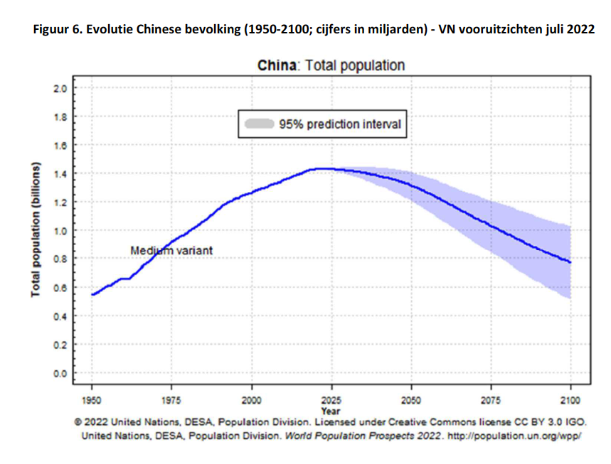 China, gezien de omvang van zijn bevolking, een zesde van het wereldtotaal, en zijn rol als groeimotor van de wereldeconomie, verdient onze bijzondere aandacht. Volgens de officiële statistieken wordt 2022 het eerste jaar sinds de Grote Hongersnood van 1959-1961 dat de Chinese bevolking krimpt. De krimp komt veel vroeger dan verwacht. In 2019 ging de Shanghai Academy of Social Sciences, China’s oudste en tweede grootste denktank voor humane en sociale wetenschappen, er nog van uit dat de Chinese bevolking pas zou pieken in 2029. De VN ging er tot voor kort van uit dat de piek van de bevolking pas zou bereikt worden in 2032. Niet dus. Voor de oorzaak moeten we even teruggaan in de tijd. In 1972 publiceerde de Club van Rome het rapport Limits to Growth dat de Apocalyps voorspelde. De Club toeterde dat de planeet afstevent op een totale ramp omdat ze de aanwas van de wereldbevolking niet zou kunnen dragen. Het rapport creëerde - net als vandaag – een wereldwijde angst voor overbevolking. Hoewel later zou blijken dat hun hypothese veel te pessimistisch waren en hun computermodellen wankel, hadden ze wat China betreft wel een punt. In 1971 bedroeg het Chinese vruchtbaarheidscijfer 5,8, een zorgwekkend hoog niveau gezien de omvang van de bevolking. De Chinese overheid voerde daarom in de jaren zeventig een beleid in dat de bevolkingsgroei wou afremmen. In 1980 was het vruchtbaarheidscijfer al teruggevallen tot 2,8. In 1980 zag de beruchte “One Child Policy” het daglicht. Dat beleid maakte er naar Chinese gewoonte, zoals we ook zagen bij de Covid-lockdowns, geen half werk van. De maatregelen omvatten een minimumleeftijd voor het huwelijk en het baren van kinderen, een limiet van twee kinderen per gezin, minimale tussenpozen tussen geboorten, streng toezicht en hoge boetes voor niet-naleving. Het werkte. En wellicht zelfs te goed. Het beleid deed het vruchtbaarheidscijfer niet alleen dalen, het draaide het gewoon de nek om. Het vruchtbaarheidscijfer bedraagt vandaag nog slechts 1,15. China doet het daarmee nog slechter dan Japan (1,3). China maakte daarom in 2016 een bocht van 180 graden door de One Child Policy te vervangen door de Two Child Policy. Maar het mocht niet baten. Zoals eerder al aangegeven, is de weg terug naar boven veel steiler dan de weg naar beneden. Spanje bijvoorbeeld kan er ook van meespreken.