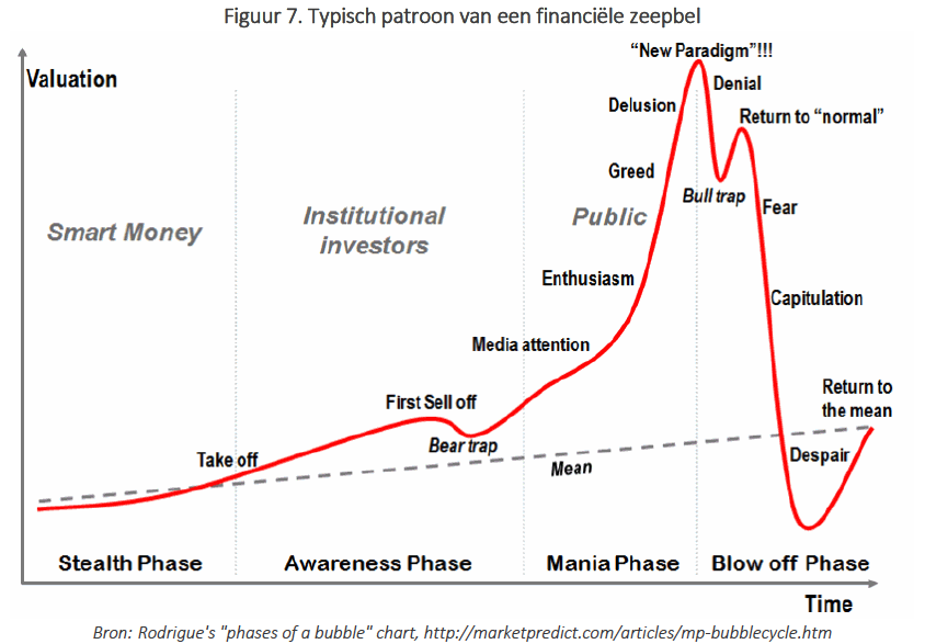 Het inflateren en deflateren van een financiële zeepbel tekent steevast hetzelfde, en zeer herkenbare, grafisch patroon. Het archetypische patroon van een zeepbel werd mooi uitgewerkt door de onvolprezen Dr. Jean-Paul Rodrigue, een transporteconoom dan nog wel, die beleggers zo wegwijs maakt: