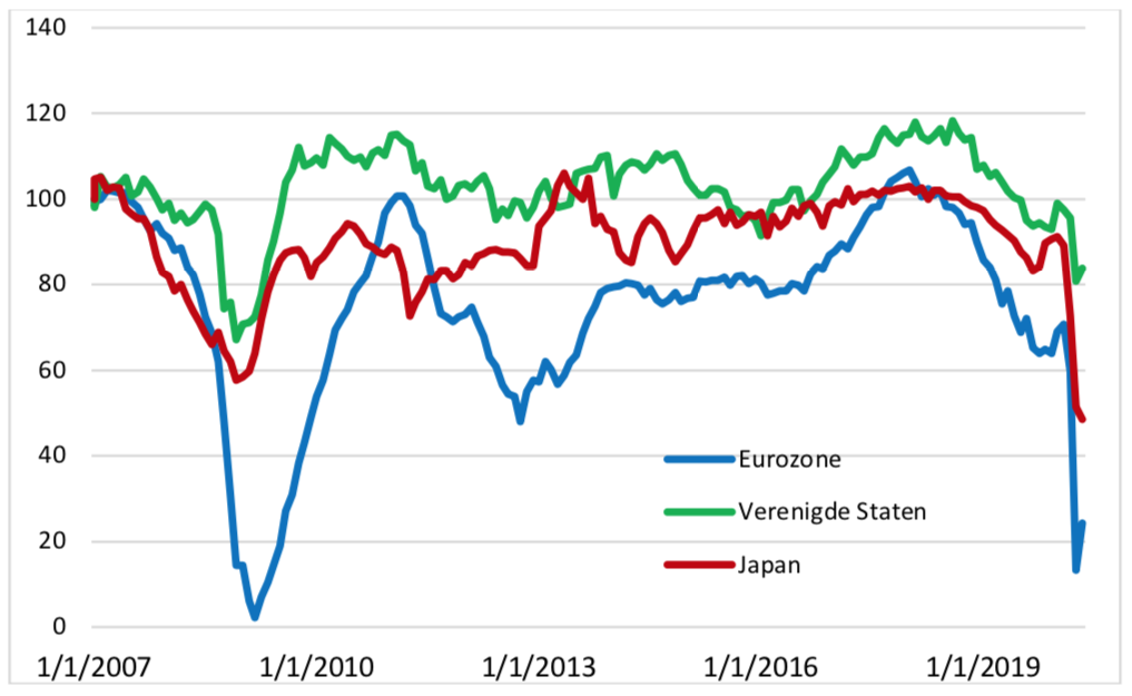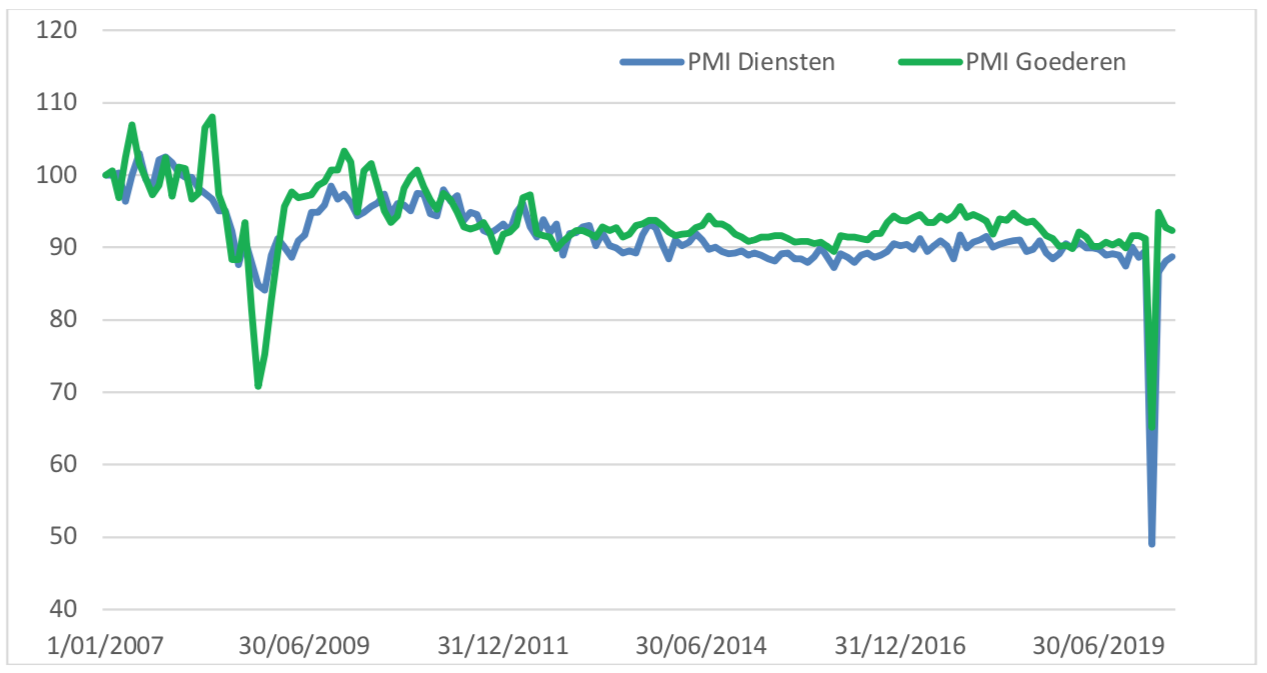 1. De covid-19 rampspoed heeft de wereld opgezadeld met een ‘zwarte zwaan’ van ongekende omvang. Veel sneller dan tijdens de financiële crisis van 2008-2009 hebben overheden incl. centrale banken gereageerd door de geldkraan wijdopen te draaien. De impact hiervan is dubbel. Aan de ene kant heeft de overheidssteun ervoor gezorgd dat bedrijven, werknemers en zelfstandigen financieel minder erg werden getroffen. M.a.w. de steun had geen expansief karakter, maar kwam gedeeltelijk in de plaats van weggevallen inkomsten. Anderzijds zijn de liquiditeitsinspanningen dermate groot, dat deze voor een belangrijk deel niet in de reële economie (de productie van goederen en diensten), maar in de financiële zijn terecht gekomen. Onder meer de scherpe stijging van de beurzen na de zware crash van midden februari tot midden maart, vindt hierin haar verklaring.