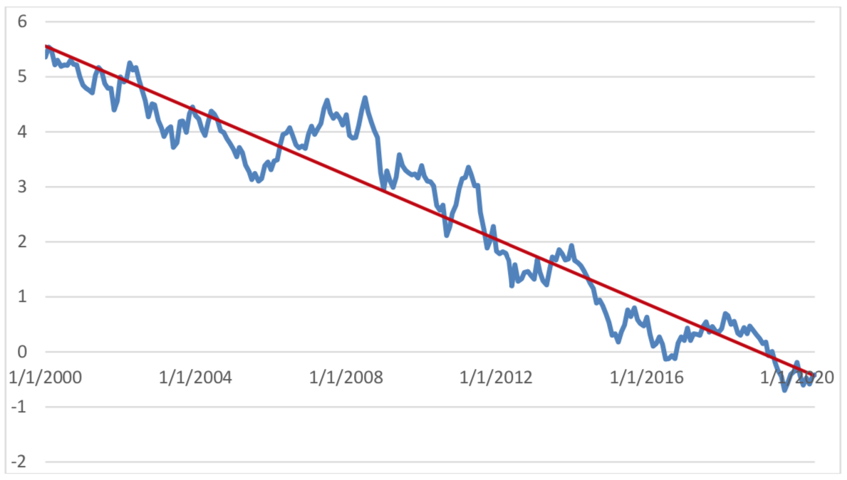 Rente-evolutie (in percent) van Bunds met een resterende looptijd van 10 jaar (van 1 januari 2000 tot 30 juni 2020, met toegevoegde trendlijn)