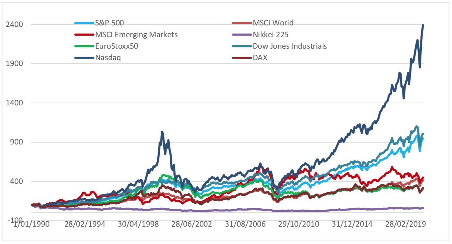 Kijken we sinds begin 1990 (= niveau 100) naar de historische koersontwikkeling van een aantal bekende beursindices, dan springen de Amerikaanse beurzen (in het blauw) uit de band. De S&P500 heeft bijna het pre-coronaniveau opnieuw bereikt, de Dow Jones Industrials heeft nog zo’n 10% goed te maken. Maar zoals hoger opgemerkt, spreekt de prestatie van de Nasdaq tot de verbeelding. Dit is nog meer het geval vergeleken met de return van de andere grote beursindices. Voor alle andere indices - met uitzondering van de MSCI World die voor ong. 60% is samengesteld uit Amerikaanse aandelen - is het huilen met de pet op. De Euro Stoxx 50 en de DAX noteren einde juni ruim onder hun hoogtepunt van begin 2000. De MSCI Emerging Markets bereikte in oktober 2007 zijn hoogste koers ooit. De Japanse beurs lijkt op deze grafiek klinisch dood: een vlakke lijn sinds bijna 30 jaar… Kortom, de Amerikaanse beurzen zijn buitenbeentjes. Voor de andere geldt zonder uitzondering de regel dat sinds begin 1990 heel de tijd belegd te zijn, niet de beste keuze was .