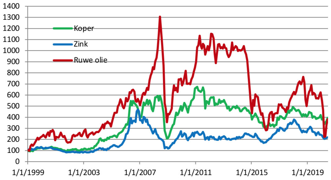 De prijsevolutie van koper, ruwe olie en zink van 1 januari 1999 t.e.m. 30 juni 2020