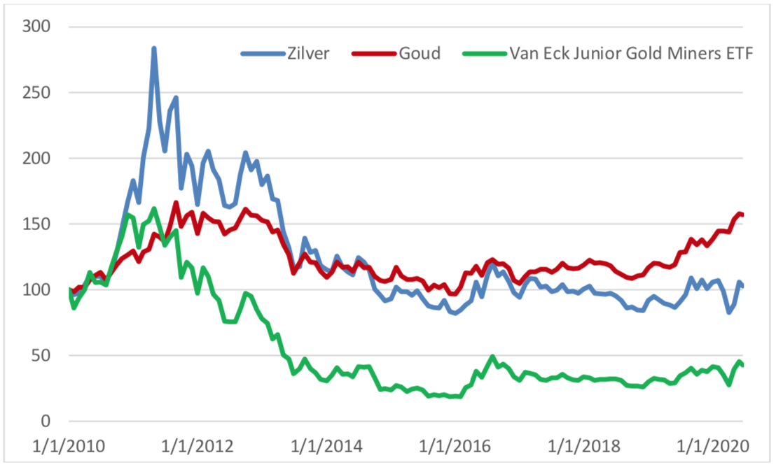 Binnenin de grote activaklasse van de grondstoffen, stonden edelmetalen (met op kop goud en zilver) van midden 2009 tot begin 2011 in het brandpunt van de belangstelling. Toen bestond de vrees dat een te grote geldcreatie zou uitmonden in snel oplopende inflatie. Vanaf 2012 bleek dat echter niet zo te zijn onder meer omdat de omloopsnelheid van het geld (het aantal keer op een jaar dat 1 euro of dollar van eigenaar verwisselt) sterk terugliep waardoor het extra gecreëerde geld minder werd gebruikt. Het gevolg was een beduidende terugval van de prijzen van edelmetalen. Die negatieve beweging duurde tot einde 2015, waarna een voorzichtige trendommekeer volgde. Deze ommekeer versnelde toen in het kader van de bestrijding van de gevolgen van covid-19 de grote centrale banken nog veel meer liquiditeiten in de economie stopten. Edelmetalen hebben het grote voordeel reële activa te vertegenwoordigen, met andere woorden, activa die niet gemakkelijk manipuleerbaar zijn. Volgende grafiek (inclusief een tracker die de koersevolutie van junior goudmijnaandelen weergeeft) laat de koersontwikkeling van goud en zilver zien.