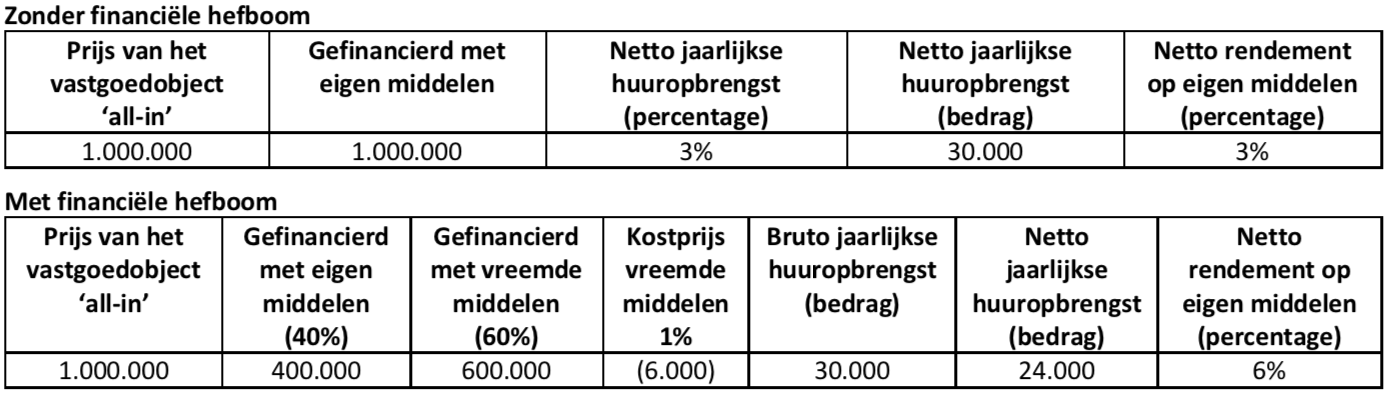 Beleggen in vastgoed gebeurt meestal met een dubbel oogmerk: aan de ene kant het innen van een aantrekkelijk jaarlijks inkomen en, anderzijds, het op termijn realiseren van meerwaarden. Wat de eerste doelstelling betreft, wordt gemikt op een hoog - bij voorkeur geïndexeerd inkomen - bv. uit de verhuur van kantoren, shoppingcenters of opslagruimten. Meerwaarden komen tot stand op het ogenblik dat voornoemde objecten boekhoudkundig worden opgewaardeerd of met winst worden verkocht. Het voorgaande betekent dat de macro-economische toestand en vooruitzichten bepalend zijn voor de gezondheid van de (geëffectiseerde) vastgoedsector. Is bv. de kantorenleegstand hoog of loopt de omzet van de supermarkten terug (in het geval de huur hieraan is gekoppeld), dan staat het jaarlijks huurinkomen onder druk en kunnen maar moeilijk interessante meerwaarden worden gerealiseerd. Daarnaast gebruiken alle beursgenoteerde vastgoedaandelen een financiële hefboom. Nu de rente ook nog de komende jaren uitzonderlijk laag blijft, ondersteunt dit het businessmodel van deze bedrijven. Immers, ze lenen tegen een ultralage rente waardoor het totaalrendement op hun vastgoedinvesteringen oploopt. Volgend eenvoudig voorbeeld verduidelijkt dit (exclusief eventuele meerwaarden).