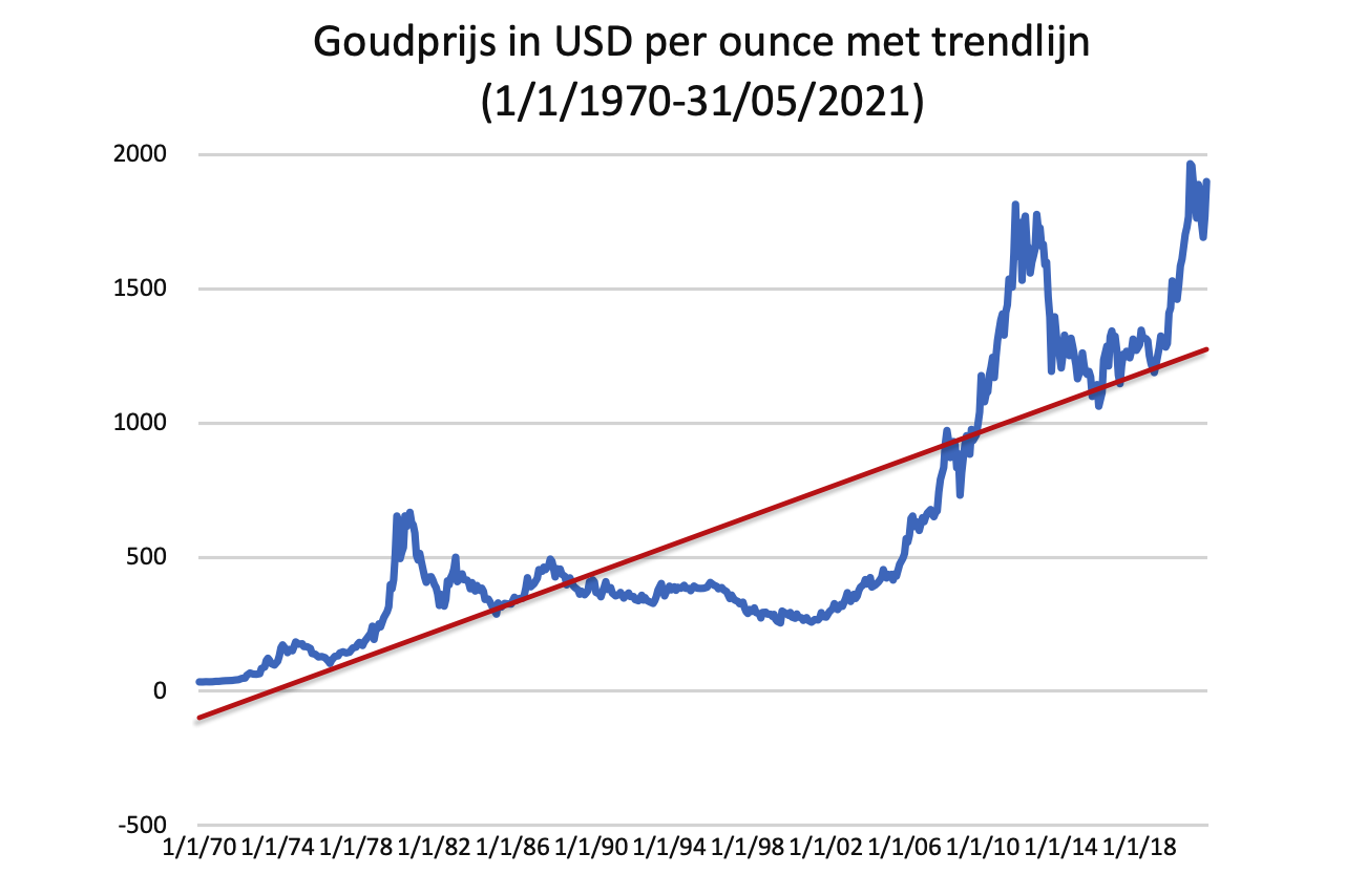 Het gemiddeld jaarlijkse rendement bedraagt 8,1%. Zoals de trendlijn aangeeft, is de goudprijs stijgend gericht. Maar die opgaande trend is het resultaat van aan de ene kant scherpe stijgingen (1971-1981, 2002-2012 en 2018-2021) en aan de andere kant forse dalingen of lange perioden met een vlak verloop (1981-1982, 1983-2002 en 2012-2015). Daarnaast blijkt het prijsverloop van fysiek goud het uitermate coulante monetaire beleid sinds de crisis van 2008 te weerspiegelen. Ultralage rentevoeten in combinatie met de voortdurende operaties van kwantitatieve versoepeling, zijn positief voor de goudprijs: de samenhang of correlatie tussen enerzijds de goudprijs en aan de andere kant de ultralage rente en massale geldcreatie is groot. Omdat de centrale banken het komende paar jaar de rente niet beduidend kunnen verhogen om reden van de ontploffende overheidsschulden en bovendien kwantitatieve versoepeling zowel als deficit spending op hoog niveau blijven, ligt het voor de hand dat de goudprijs trendmatig blijft stijgen.