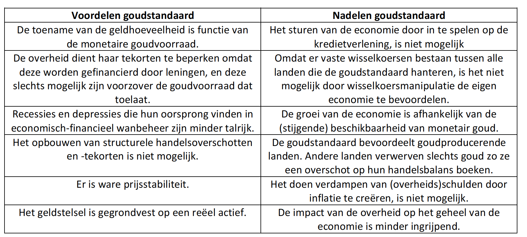 In de basisversie van de goudstandaard wordt de waarde van een munt uitgedrukt als een vast gewicht in goud. Op ieder ogenblik is een bankbiljet omwisselbaar in fysiek goud. Dit impliceert dat de som van alle bankbiljetten en de meteen opvraagbare banktegoeden moeten gedekt zijn door de monetaire goudvoorraad, normaliter in handen van de centrale bank. Tussen landen die de goudstandaard hebben ingevoerd - en dus de eigen munt tegen een vaste koers aan fysiek goud hebben gekoppeld - liggen de onderlingende wisselkoersen vast. Indien landen onder de goudstandaard betalingsbalanstekorten boekten, moesten ze die aanzuiveren door aan de overschotlanden goud fysiek te leveren voor een bedrag gelijk aan het tekort. Gelet op de omwisselbaarheid op ieder ogenblik van bankbiljetten en banktegoeden in fysiek goud, is in dit systeem de goudvoorraad bepalend voor het toekennen van krediet. Daarom heeft de goudstandaard een louterend effect op de economische conjunctuur9. Een overzicht van de belangrijkste voor- en nadelen van de goudstandaard (of, meer algemeen, van een genormeerd geldstelsel tegenover een geldstelsel gebaseerd op fiduciair geld), geeft volgende tabel.