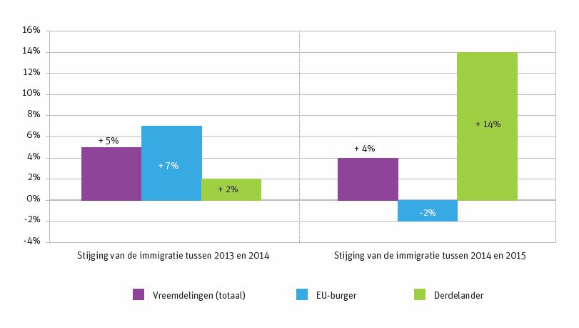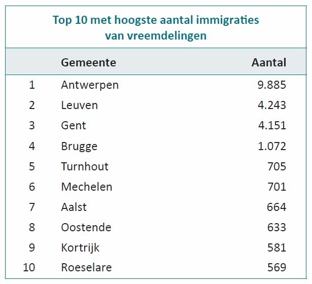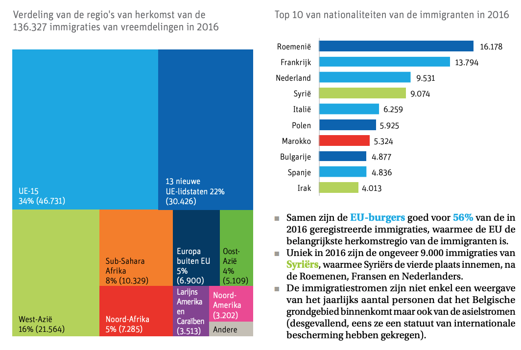 De Belgische top 5 van meest voorkomende nationaliteiten van internationale immigranten in 2015 (leeftijd meestal 18 tot 34) wordt aangevoerd door de Fransen, gevolgd door de Roemenen, Syriërs, Irakezen en Nederlanders. Syriërs halen overigens de top 5 in verschillende EU-15 landen.