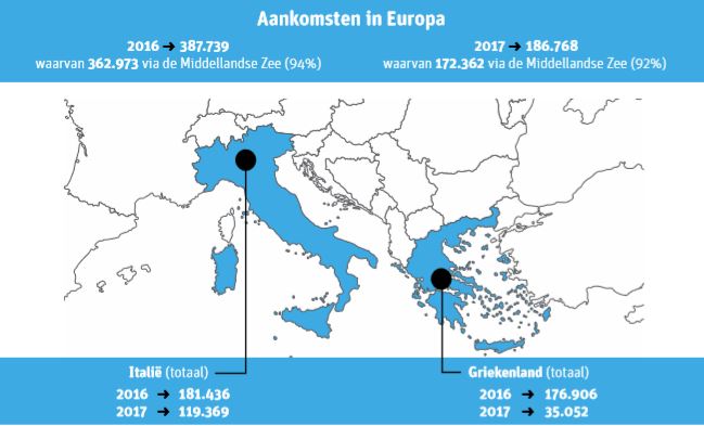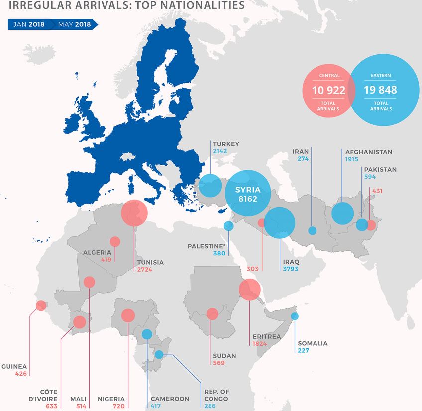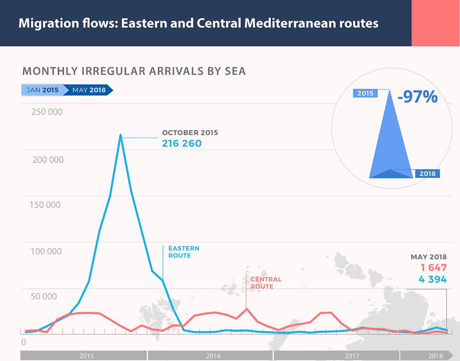 De route door het centrale en westelijke Middellandse Zeegebied is sinds enige tijd het meest gebruikte traject richting Europese Unie (EU). Als gevolg hiervan trekt het gros van de migranten uit Noord-Afrika en Afrika bezuiden de Sahara door Marokko, Algerije en vooral Libië, wat in dat land netwerken van mensensmokkelaars en slavenhandelaars heeft doen ontstaan. De EU heeft inmiddels concrete stappen ondernomen om de migratiesituatie in Libië te verbeteren en de diepere oorzaken van migratie in Afrika aan te pakken. Zo heeft de EU via het EU-noodtrustfonds voor Afrika tot dusver 237 miljoen euro vastgelegd voor de financiering van programma's in Libië. Wat het oostelijke Middellandse Zeegebied aangaat (illegale oversteek over de Egeïsche Zee van Turkije naar Griekenland), heeft de EU in maart 2016 aan Turkije 3 miljard euro toegezegd voor de opvang van voornamelijk Syrische oorlogsvluchtelingen. In juni 2018, twee jaar later, zijn de EU-lidstaten overeengekomen hiervoor in principe een tweede schijf van 3 miljard euro vrij te maken (zie supra).
