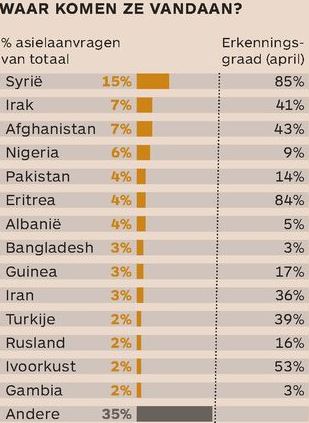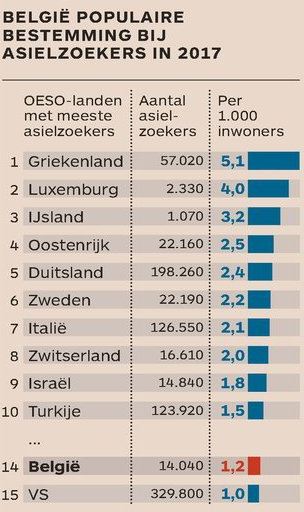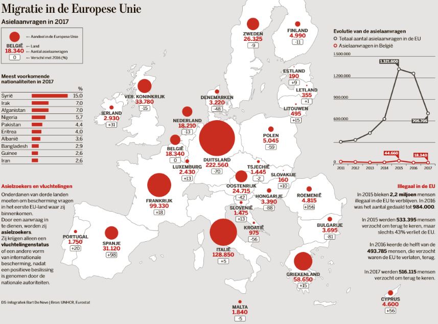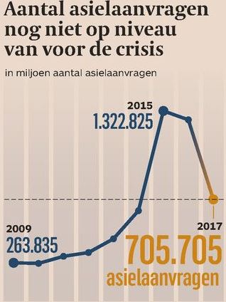 Bronnen: CGVS (Asielstatistieken december 2017) en Eurostat - De Tijd 12 januari en 23 juni 2018