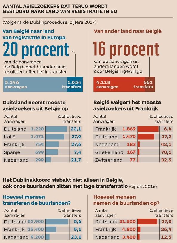 Tegenover de een op vijf effectieve uitzettingen plaatst België een op tien terugnames uit andere landen. 'Dublin' blijkt overigens in heel Europa vaak dode letter te blijven. Duitsland slaagde er vorig in maar 5,6% van de asielzoekers voor wie het een Dublinclaim indiende, inderdaad uit te zetten. Dat blijkt uit de cijfers van het Europees statistisch bureau Eurostat. In de andere buurlanden Frankrijk en Nederland is dat respectievelijk 5,1 en 23,1%. Omgekeerd aanvaardde Duitsland vorig jaar maar 27 % van de Dublin-claims die het zelf binnenkreeg, Frankrijk 26,4% en Nederland 12,5%.
