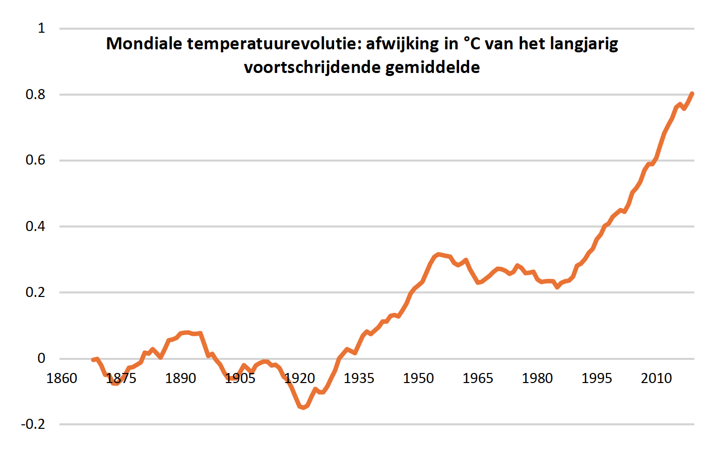 De wereldwijde temperatuurstijging gemeten aan de afwijking van het langjarig voortschrijdend gemiddelde, kent een eerste opflakkering rond het einde van de 19de eeuw. Na een periode van afkoeling volgt van 1935 tot 1955 een eerste forse toename. Nadien (1956-1988) is er sprake van stabilisering op een hoger niveau. Sindsdien wordt de positieve afwijking van de langjarige trend almaar groter. Vandaag ligt de temperatuur in België (Ukkel) gemiddeld 2,6°C hoger dan voor de industriële revolutie.2