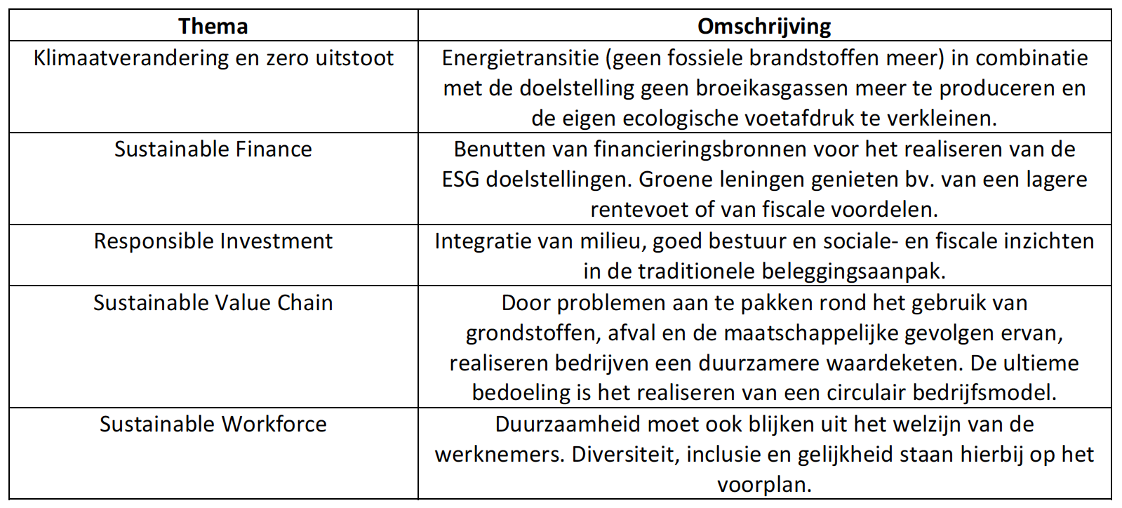 Je kunt ESG beleggingen op verschillende manieren klasseren, maar de meest gebruikte indeling is die op basis van het beleggingsthema. Voor veel beleggers is dat de evidentste aanpak. Een andere klassering bv. op basis van de rol van het bedrijf in de vergroening van zijn sector, spreekt veel minder aan. Een voorbeeld van thematische onderverdeling is de volgende16: