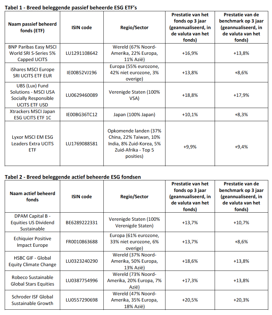 Anderzijds vind je almaar meer fondsen, vooral ETF’s, die op basis van een brede index zoals de EuroStoxx50 of de S&P’s 500, een ESG vriendelijke versie ervan aanbieden. De selecties die we in het volgende hoofdstuk maken, volgen deze dubbele invalshoek.