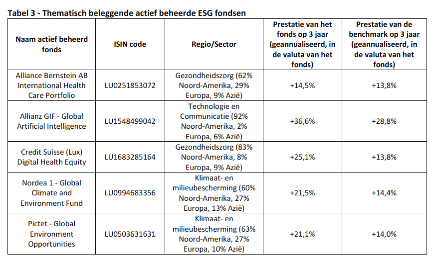 Bij de thematisch beleggende actief beheerde ESG fondsen blijkt het element stockpicking nog meer door te wegen. Aandelen van bedrijven met een kleinere marktkapitalisatie krijgen een groter gewicht. Dit heeft als gevolg dat de fondsen van Credit Suisse en Nordea eerder als small & midcap fondsen moeten omschreven worden. Wat de thema-fondsen betreft, is onze selectie beperkt tot drie grote sectoren. Andere sectoren die recent in het brandpunt van de belangstelling stonden zoals bv. waterstofenergie of de opslag van CO2 hebben we buiten beschouwing gelaten; ze vertonen oververhittingsverschijnselen.
