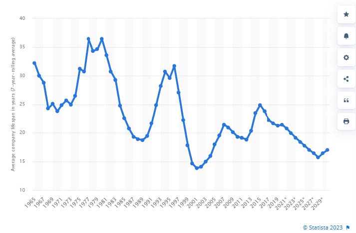 Wie kent ze niet, de ondernemingen die vroeger leken te drijven op een wolk van succes, maar plots aan een versnellend tempo beginnen te verbrokkelen. Ondernemingen komen en gaan aan een ijltempo. Figuur 4 toont de gemiddelde levensduur van een Amerikaanse onderneming als lid van de S&P500 index: