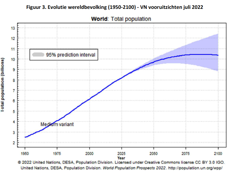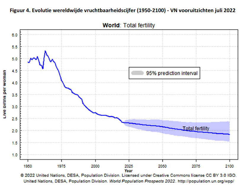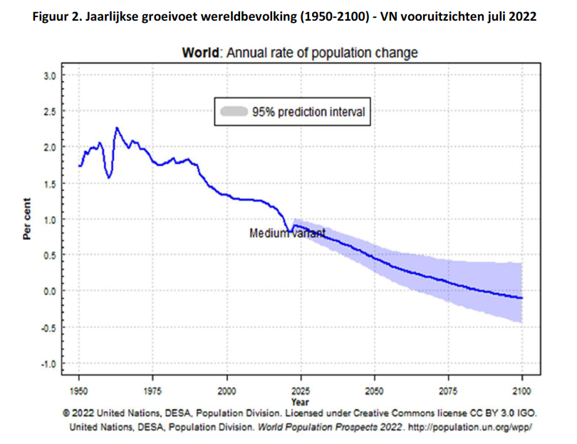 Sinds 1962 heeft de groeivoet een daling ingezet. Vandaag bedraagt de groeivoet nog 1% en vooruitgaand zou hij, volgens de schattingen van de VN in haar rapport van juli 2022, rond 2085 terugvallen tot nul (zie Figuur 2).