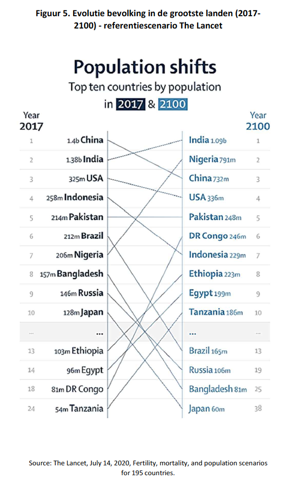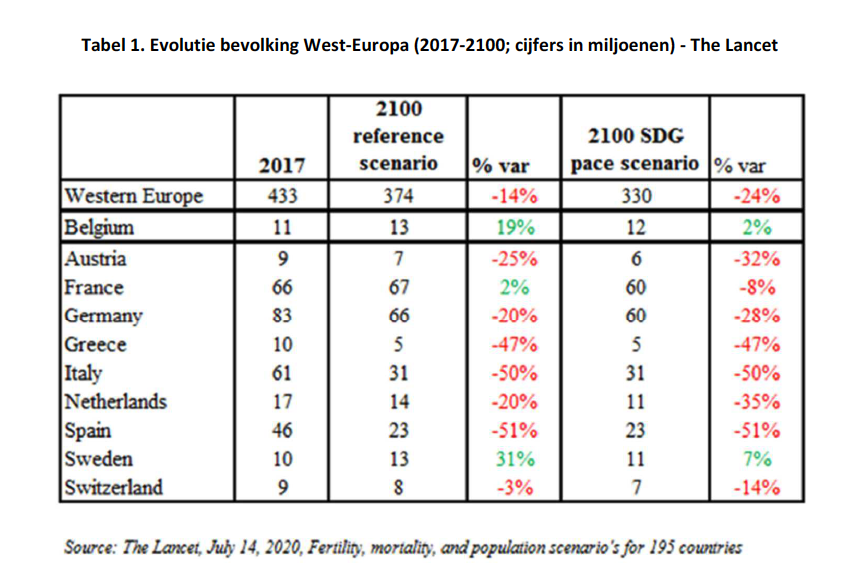 Van Japan is alom geweten dat het bevolkingsaantal er in vrije val is. Sinds 2010 zijn er elke nieuwe dag minder Japanners dan de dag ervoor. In 2100 zal de Japanse bevolking met meer dan de helft zijn gedaald. Maar Japan staat niet alleen. Ook China, waar de bevolking tussen 1961 en 2021 steeg van 660 miljoen naar 1,4 miljard, ziet zijn bevolking bijna halveren. De vooruitzichten van de VN (zie Figuur 6) zien de Chinese vooruitzichten iets minder somber in en komen uit op een bevolkingsaantal van circa 800 miljoen in 2100, een daling van 43%. In het referentiescenario van The Lancet moet China de eerste plaats afstaan aan Indië, ofschoon Indië zelf zijn bevolking met 30% ziet krimpen. China wordt ook voorbijgestoken door Nigeria, een land met een uitzonderlijk hoog vruchtbaarheidscijfer. Rusland ziet zijn bevolking dalen met 40 miljoen, al dan niet toevallig equivalent aan de bevolking van Oekraïne. Naast het referentiescenario toont The Lancet het "SDG Pace scenario". SDG staat voor de Sustainable Development Goals van de VN, waaronder het bestrijden van honger en armoede en het bestendigen van leefbare steden. Indien de wereld erin slaagt deze SDGs te realiseren, dan zou de wereldbevolking in 2100 niet uitkomen op 11 of op 8,8 miljard mensen, maar op 6,3 miljard mensen, 1,4 miljard minder dan vandaag. De grootste impact van het behalen van de SDGs vinden we natuurlijk in de minder ontwikkelde landen (waar vruchtbaarheidscijfers alsnog hoog zijn). In het SDG Pace scenario zou de Nigeriaanse bevolking bijvoorbeeld niet groeien van 206 tot 791 miljoen in 2100 maar "slechts" tot 409 miljoen. In de Democratische Republiek Congo zou de bevolking niet aangroeien tot 246 miljoen maar tot 106 miljoen. België kampioen Maar de grote verschuivingen tekenen zich niet alleen af in de “opkomende” (?) landen, maar ook dichter bij huis. Het Europese plaatje wordt weergegeven in Tabel 1. De West-Europese bevolking is aan het krimpen. Slechts een paar landen ontspringen de dans. Enkel België, Frankrijk en Zweden zien hun bevolking nog aandikken. Elders zijn er forse dalingen. Zuid-Europa is een ramp, tenzij u vindt dat een halvering van de bevolking goed nieuws is. De Nederlandse bevolking daalt met een derde en wordt in aantal voorbijgestoken door België. 2100 is nog veraf, maar de nieuwe demografische realiteit is er al voor morgen (of voor gisteren, zoals in Japan). De bevolking in de Europese Unie zou weliswaar nog lichtjes stijgen de komende 3 jaar, maar daarna gaat het bergaf.