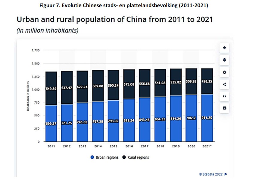 In haar rapport van juli 2022 gaat de VN ervan uit dat de Chinese arbeidsbevolking het volgende decennium een duik neemt. Tegen 2100 zou de Chinese arbeidsbevolking met 2/3 dalen (!). En, pro memorie, deze voorspelling gebruikt de onrealistisch optimistische hypothese dat het Chinese vruchtbaarheidscijfer met bijna de helft zal stijgen. Meer realistisch mogen we ervan uitgaan dat de Chinese arbeidsbevolking met minstens 3/4 zal dalen. De onvermijdelijke conclusie De voorbije decennia heeft China hoge economische groeicijfers opgetekend. Meer dan door de groei van de bevolking werd deze groei gedreven door een enorme stijging van de arbeidsproductiviteit. Die laatste werd gedreven door de massale plattelandsvlucht. De productiviteit van een Chinese werknemer in de stad is 4 keer hoger dan op het platteland. Er zit nog wat rek op die migratie naar de steden, maar ook die tendens loopt ten einde. Vandaag wonen al meer dan 900 miljoen Chinezen in steden (zie Figuur 7).