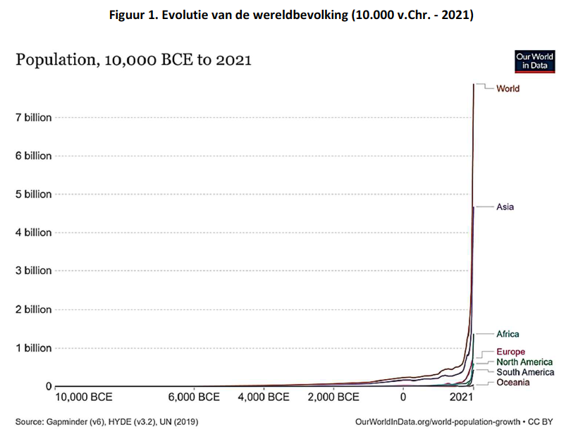 Het duurde tot 1.000 v.Chr. voor we de kaap van de 100 miljoen voorbijstaken en in 1800 bereikten we de kaap van de 1 miljard. De wereldbevolking is inderdaad spectaculair gegroeid (zie Figuur 1).