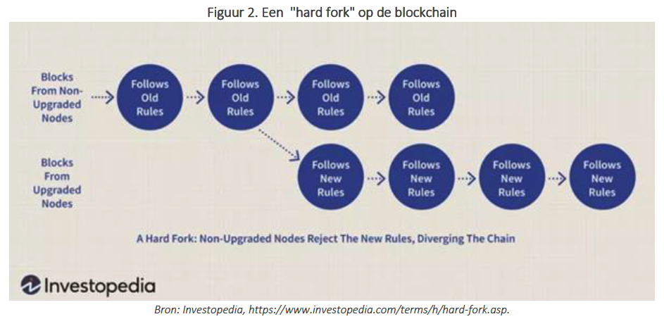 De miners (de partijen die de computer nodes bezitten waarop een blockchainprotocol draait) controleren de blockchain. Enkel wanneer alle miners instemmen met de regels van een blockchainprotocol kunnen nieuwe blocks (dit zijn een bepaald aantal transacties) worden toegevoegd aan de blockchain. Maar soms is er onenigheid tussen miners over nieuwe regels om een block te aanvaarden. Indien die onenigheid blijft bestaan, ontstaan vertakkingen (hard forks genoemd) op de blockchain. Onderstaand schema verduidelijkt dit (hopelijk):