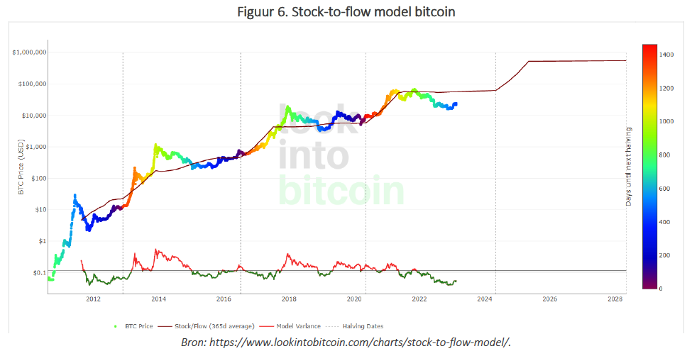 Wellicht het meest populaire prijsmodel voor bitcoin is het “stock-to-flow” model, dat gebaseerd is op de schaarste van nieuwe bitcoins in verhouding tot het aantal bestaande bitcoins. Het achterliggend idee is dat, naarmate de schaarste van nieuwe bitcoins vergroot, de waarde (en de prijs) van de bitcoin verhoogt.