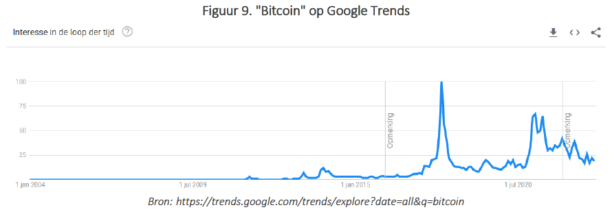 De bitcoin mania loopt op zijn laatste benen. Dit kan je niet alleen aflezen uit het grafische verloop, maar ook uit het tanende enthousiasme. Het continu opwekken van nieuw enthousiasme werkt op termijn mentaal uitputtend, net als bij de supporters van RSC Anderlecht. Google Trends bevestigt dat dit via een wegdeemsterende interesse in bitcoin: