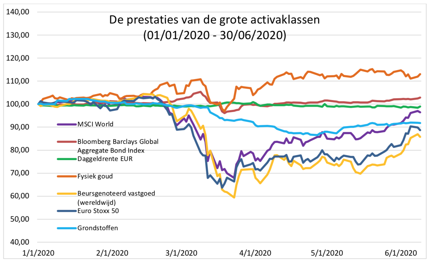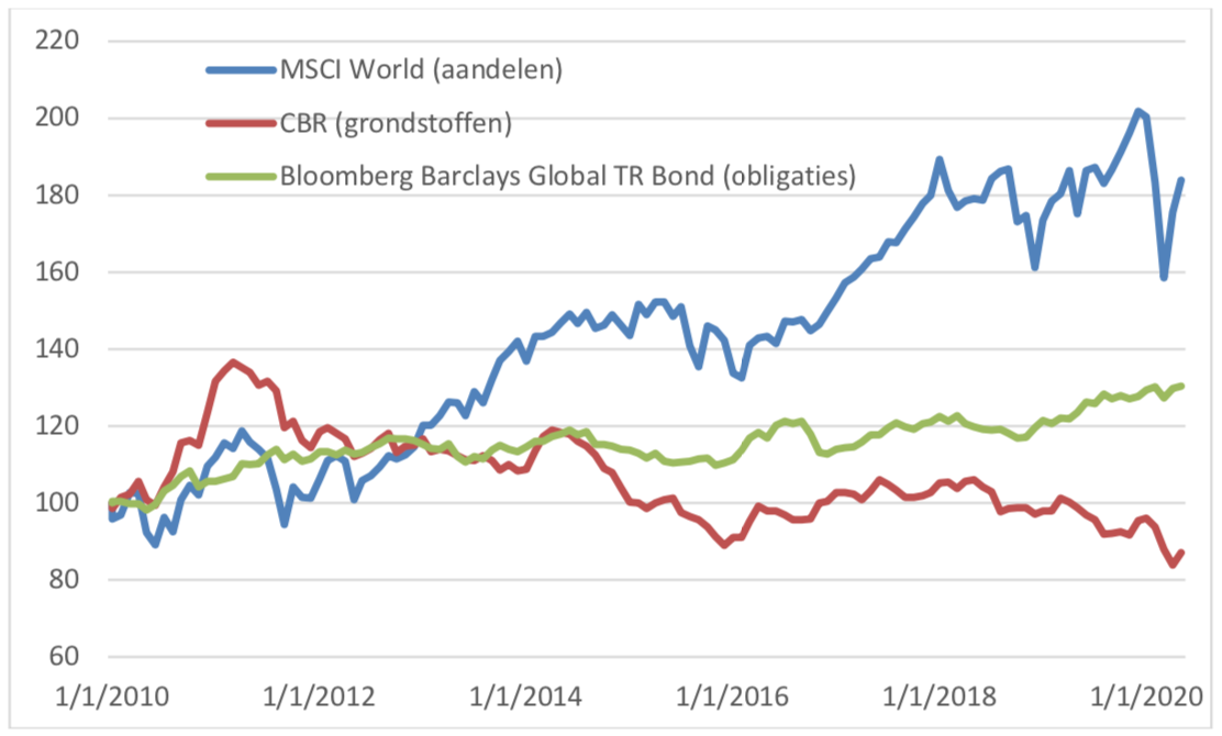 Aandelen, obligaties en grondstoffen met elkaar vergeleken van 1 januari 2010 t.e.m. 30 juni 2020