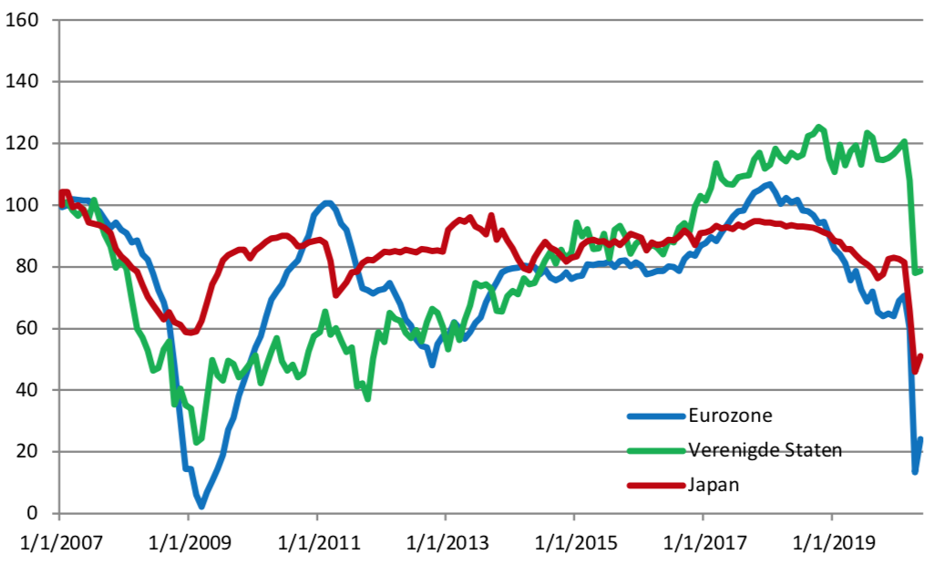 1. De covid-19 rampspoed heeft de wereld opgezadeld met een ‘zwarte zwaan’ van ongekende omvang. Veel sneller dan tijdens de financiële crisis van 2008-2009 hebben overheden incl. centrale banken gereageerd door de geldkraan wijdopen te draaien. De impact hiervan is dubbel. Aan de ene kant heeft de overheidssteun ervoor gezorgd dat bedrijven, werknemers en zelfstandigen financieel minder erg werden getroffen. M.a.w. de steun had geen expansief karakter, maar kwam gedeeltelijk in de plaats van weggevallen inkomsten. Anderzijds zijn de liquiditeitsinspanningen dermate groot, dat deze voor een belangrijk deel niet in de reële economie (de productie van goederen en diensten), maar in de financiële zijn terecht gekomen. Onder meer de scherpe stijging van de beurzen na de zware crash van midden februari tot midden maart, vindt hierin haar verklaring.