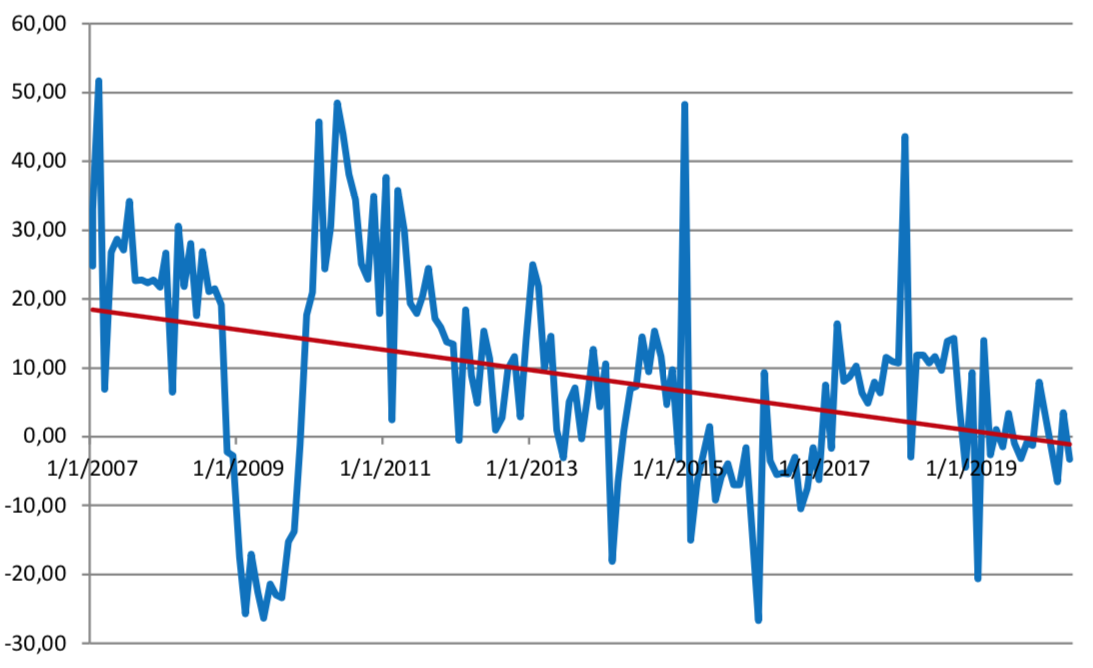 Rente-evolutie (in percent) van Bunds met een resterende looptijd van 10 jaar (van 1 januari 2000 tot 30 juni 2020, met toegevoegde trendlijn)