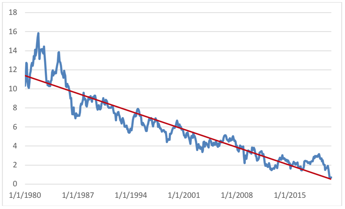 De rente (in percent) op Amerikaanse overheidsobligaties met een resterende looptijd van 10 jaar van 1 januari 1980 tot 30 juni 2020 (met toegevoegde trendlijn)
