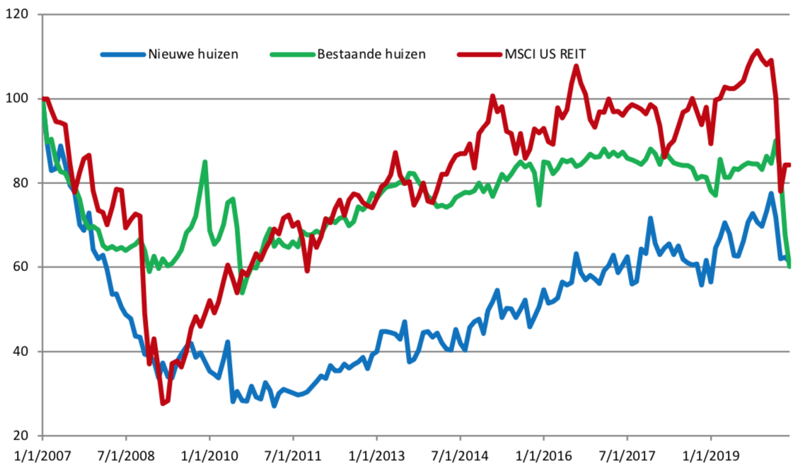 De verkoop van nieuwe en bestaande woningen in de Verenigde Staten en de evolutie van de MSCI REIT USA Index (van 1 januari 2007 t.e.m. 30 juni 2019)