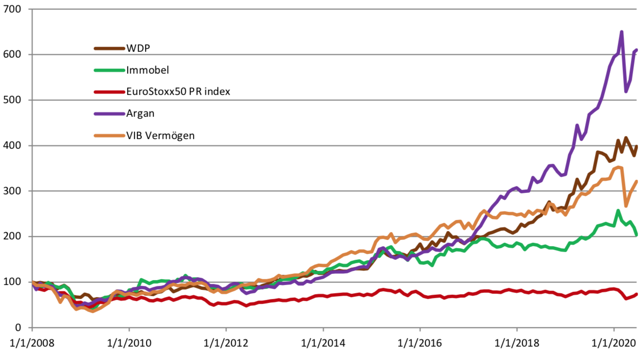 Omdat vastgoed soms (te) duur is geworden en de gevolgen op lange termijn van de covid-19 pandemie onduidelijk zijn, is selectiviteit meer dan ooit op haar plaats. Sommige vastgoedsectoren koppelen interessante vooruitzichten aan lage tot zeer lage waarderingen. Dit betreft o.a. de grotere Europese shoppingcentra (mits het hoger genoemde voorbehoud) en, zoals hoger aangestipt, logistiek vastgoed. Voor andere is er echter sprake van oververhitting (zie hoger). Omdat we ons in dit Memo beperken tot beursgenoteerd vastgoed en deze sector bekijken vanuit Europees standpunt, zoomen we in volgende grafiek in op de koersevolutie van een aantal Europese genoteerde vastgoedfondsen. Dit betreft Argan (een Frans bedrijf dat belegt in logistiek vastgoed), Immobel (een Belgisch bedrijf dat aan vastgoedontwikkeling doet), VIB Vermögen (een Duits bedrijf dat belegt in kantoren en woningen) en Warehouses De Pauw - WDP (een Belgisch bedrijf dat vooral belegt in Belgisch en Nederlands logistiek vastgoed). Tenslotte vergelijken we deze vijf vastgoedaandelen van 1 januari 2008 t.e.m. 30 juni 2019 met de Euro Stoxx 50 index (alles exclusief uitgekeerde dividenden).