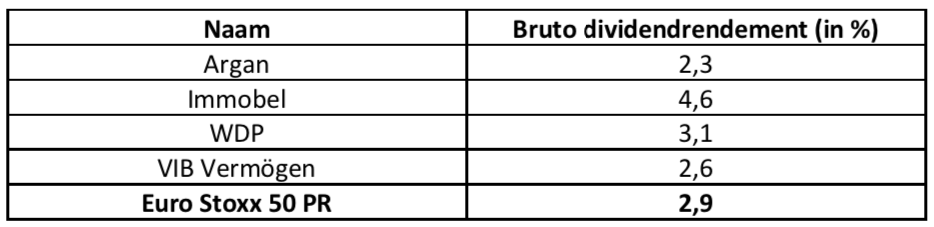 Midden 2020 noteert de Euro Stoxx 50 PR index 26,1% lager dan begin 2008. Maar de geselecteerde vastgoedaandelen hebben de crisis duidelijk achter zich gelaten, waarbij vooral de prestatie van het logistiek vastgoed in het oog springt (Argon en WDP). Maar ook Immobel en VIB Vermögen doen het goed. Opgelet! Dit betreft uitsluitend koersprestaties, d.w.z. zonder rekening te houden met de uitgekeerde dividenden die soms op een hoger niveau liggen dan deze uitgekeerd door bedrijven opgenomen in de Euro Stoxx 50 index; zie onderstaand overzicht per 30 juni 2020.