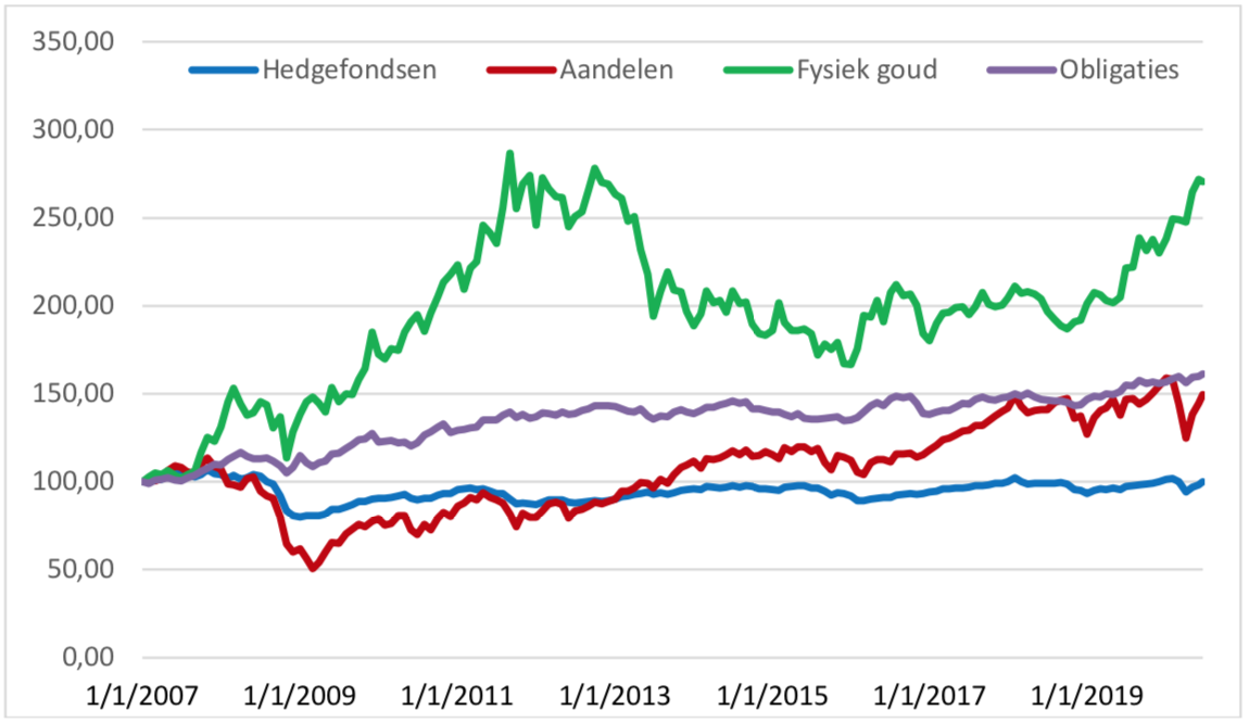 Door de bank genomen stellen alternatieve beleggingen - waaronder afgeleide producten zoals hedgefondsen - sinds midden 2007 (het uitbreken van de financiële crisis) tot midden 2020 teleur. Hun prestatie is slechter dan die van de grote activaklasse van de aandelen (die gedurende deze periode nochtans twee keer crashten) en verbleekt bij die van overheidsobligaties van ‘investment grade’ kwaliteit en bij die van goud. Uit volgende grafiek blijkt dat fysiek goud sinds begin 2007 het beste scoort, gevolgd door overheidsobligaties en aandelen (beide ong. +50% tegenover begin 2007). De HFRX Global Hedge Fund Index staat echter op een miniem verlies van 0,1%. De volatiliteit van deze index is weliswaar beduidend lager dan die van aandelen en goud (maar niet zoveel lager dan die van overheidsobligaties), zodat dit resultaat zonder meer ontgoochelend is. De meerwaarde van een belegging in hedgefondsen, gemeten aan deze index, is bijgevolg onbestaand.