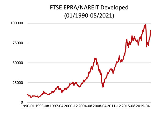 De hamvraag is hoe vastgoed op lange termijn rendeert. De FTSE EPRA/Nareit Developed index die de koersevolutie van beursgenoteerde vastgoedaandelen weergeeft, heeft van begin 1990 tot einde mei van dit jaar een rendement van gemiddeld 7,2% per jaar laten zien (zie onderstaande grafiek, in USD, zonder kapitalisatie van dividend, niet gecorrigeerd voor inflatie). De MSCI World aandelenindex (eveneens in USD, zonder kapitalisatie van dividend, niet gecorrigeerd voor inflatie)23 blijft met gemiddeld 5,4% per jaar duidelijk achter. Maar dit zijn allebei ruime indices. Ze betreffen weliswaar beide de geïndustrialiseerde wereld, maar verder zijn ze breed gespreid over regio’s en sectoren.