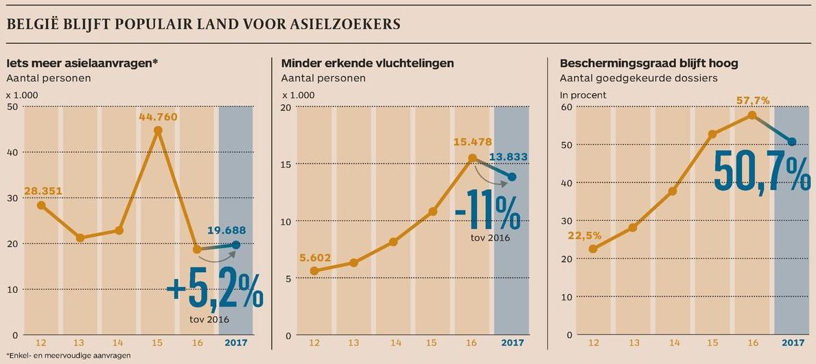 Bronnen: CGVS (Asielstatistieken december 2017) en Eurostat - De Tijd 12 januari en 23 juni 2018