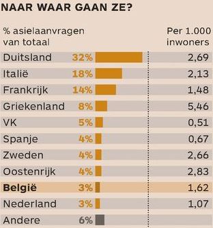 Tegenover de een op vijf effectieve uitzettingen plaatst België een op tien terugnames uit andere landen. 'Dublin' blijkt overigens in heel Europa vaak dode letter te blijven. Duitsland slaagde er vorig in maar 5,6% van de asielzoekers voor wie het een Dublinclaim indiende, inderdaad uit te zetten. Dat blijkt uit de cijfers van het Europees statistisch bureau Eurostat. In de andere buurlanden Frankrijk en Nederland is dat respectievelijk 5,1 en 23,1%. Omgekeerd aanvaardde Duitsland vorig jaar maar 27 % van de Dublin-claims die het zelf binnenkreeg, Frankrijk 26,4% en Nederland 12,5%.