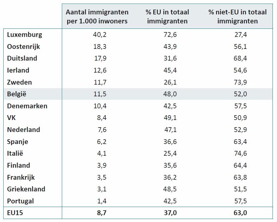 De Belgische top 5 van meest voorkomende nationaliteiten van internationale immigranten in 2015 (leeftijd meestal 18 tot 34) wordt aangevoerd door de Fransen, gevolgd door de Roemenen, Syriërs, Irakezen en Nederlanders. Syriërs halen overigens de top 5 in verschillende EU-15 landen.