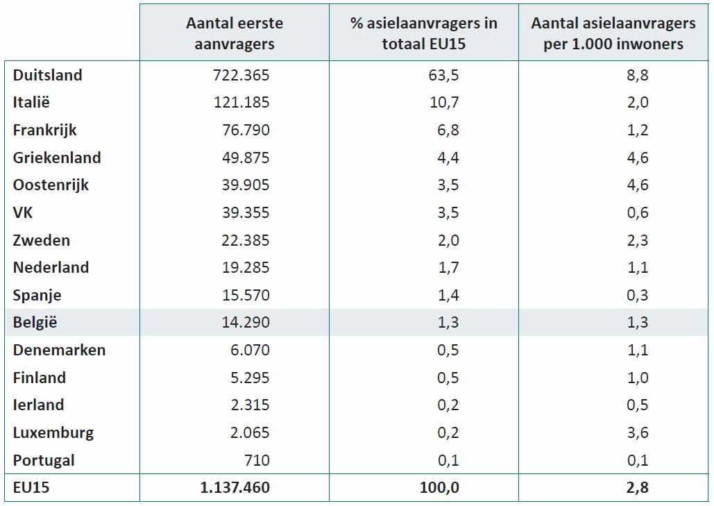 Totaal aantal eerste asielaanvragers (afgerond tot op 5), aandeel ten opzichte van het totaal aantal aanvragers in de EU15 (in %) en aantal asielaanvragers per 1.000 inwoners, EU15-landen*, 2016