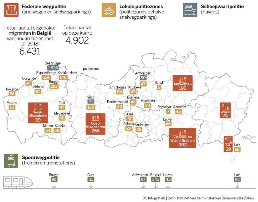 Wat ten slotte de transitmigranten betreft, daarvan zijn er volgens de DVZ In de eerste zeven maanden van 2018 in totaal 6.431 onderschept in België, waarvan de meesten zeggen te komen uit Eritrea (2.521), Irak (587), Algerije (347), Soedan (347) en Syrië (290). 3.262 keer gaf de DVZ een bevel om het grondgebied te verlaten, 1.154 keer een nieuw bevel aan dezelfde personen. Slechts 490 transmigranten werden in een gesloten centrum ondergebracht, waarvan gemiddeld 8 op de 10 effectief werden gerepatrieerd. Volgens Nicholas Paelinck, korpschef van politiezone Westkust, is het ‘dweilen met de kraan open. Wie wordt opgepakt , wordt de volgende dag weer vrijgelaten. Soms wordt iemand twintig keer opgepakt door dezelfde diensten.’