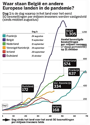 De langverwachte deus ex machina, de coronabarometer, is er nog altijd niet, maar in deze hoogste alarmfase is hij irrelevant. Coronacommissaris Pedro Facon werkt nog aan de ‘protocollen’. Volgens Maarten Vansteenkiste, motivatiepsycholoog UGent en lid van corona-adviesorgaan Celeval, hebben premier Alexander De Croo en minister van Volksgezondheid Frank Vandenbroucke hun boodschap ‘authentiek, empathisch, vertrouwenwekkend, motiverend en zeer helder gebracht, daarvoor verdienen ze alle lof’ (Het Nieuwsblad 16/10/2020). Het is maar aan welke kant van de (financiële) barrière je staat natuurlijk. Politici, ambtenaren, academici, journalisten korten niet in op hun salaris, de getroffen ondernemers en werknemers wel. Professor Frank heeft benadrukt dat de overheid ‘diep in de geldbuidel zal tasten’ om de horeca te ondersteunen. In de geldbuidel van de belastingbetalers wel te verstaan. Uiteraard is de regeringscommunicatie in alle opzichten beter dan het oeverloze gebazel van Sophie Wilmès. Uiteraard is het, net zoals in andere Europese landen die misplaatst eigenzinnig het Aziatische voorbeeld niet volgen, noodzakelijk decisief in te grijpen om de exponentiële toename van covid-19 in te dijken en de ziekenhuizen (intensieve zorg) niet in de problemen te brengen. Alleen kan dat optreden doelgerichter en zonder een economische bedrijfstak als de horeca (incluis zijn sociale functie) volledig in het gedrang te brengen. Meer anticipatie en minder post factum reageren is ook geen overbodige luxe. We leven nu in een angstcultuur die het maatschappelijk leven ontwricht. De staatsomroepen brengen dag in, dag uit kommer en kwel, vooral in de televisie-journaals. Er is veel aandacht voor jammerklachten, maar te weinig voor de effectiviteit van de behandeling van covid-19 patiënten in de ziekenhuizen. Welke antivirale geneesmiddelen en welke technieken zetten zij in? Wat is daarvan de succesratio? Wat bevordert genezing? Hoe ver staan we nu echt in de wereldwijde zoektocht naar vaccins? Wat is een realistisch tijdsverloop vooraleer ze op grote schaal beschikbaar zijn? Meer perspectief op verbetering, meer oog voor oplossingen. Niet enkel in duidingsprogramma’s, maar vooral in de radio- en televisie-journaals. Dat werkt ongetwijfeld meer motiverend en spoort aan om de huidige sanitaire veiligheidsvoorschriften na te volgen. De volgende illustraties schetsen de positie van België in Europa en de wereld wat covid-19 besmettingen aangaat: